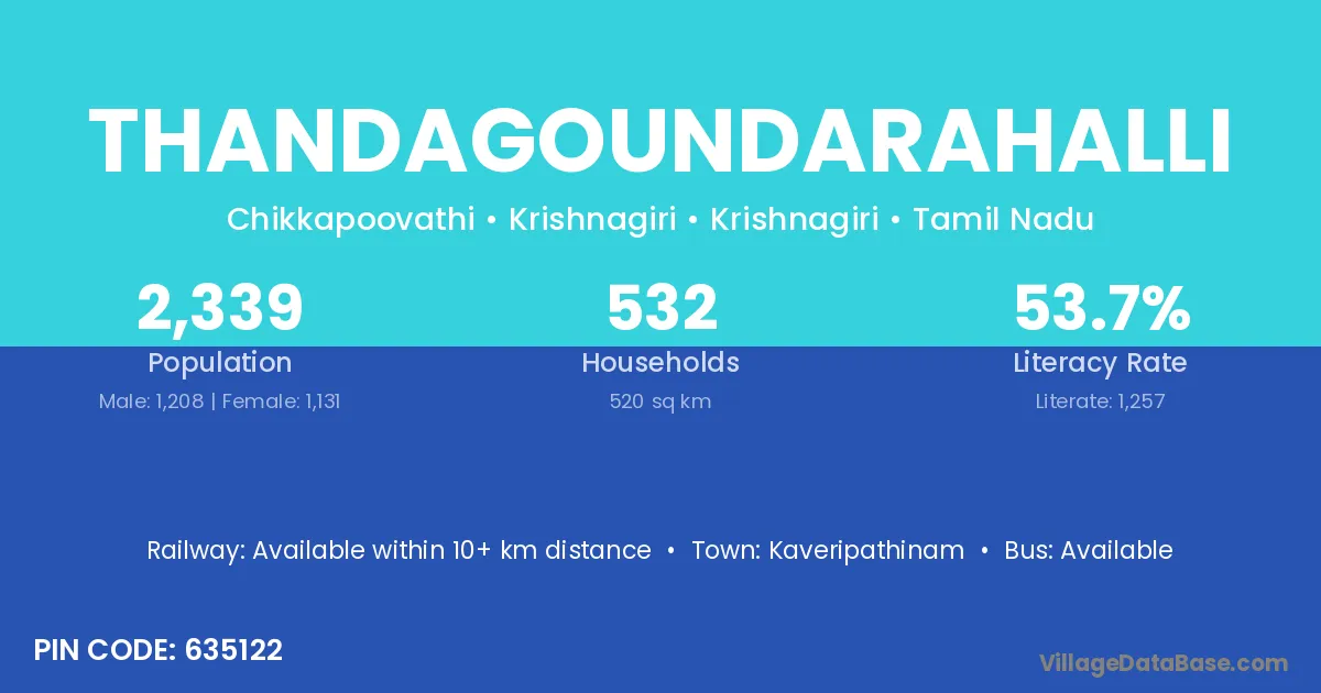 Thandagoundarahalli village has a total population of 2,339 people, of which 1,208 are males and 1,131 are females.
