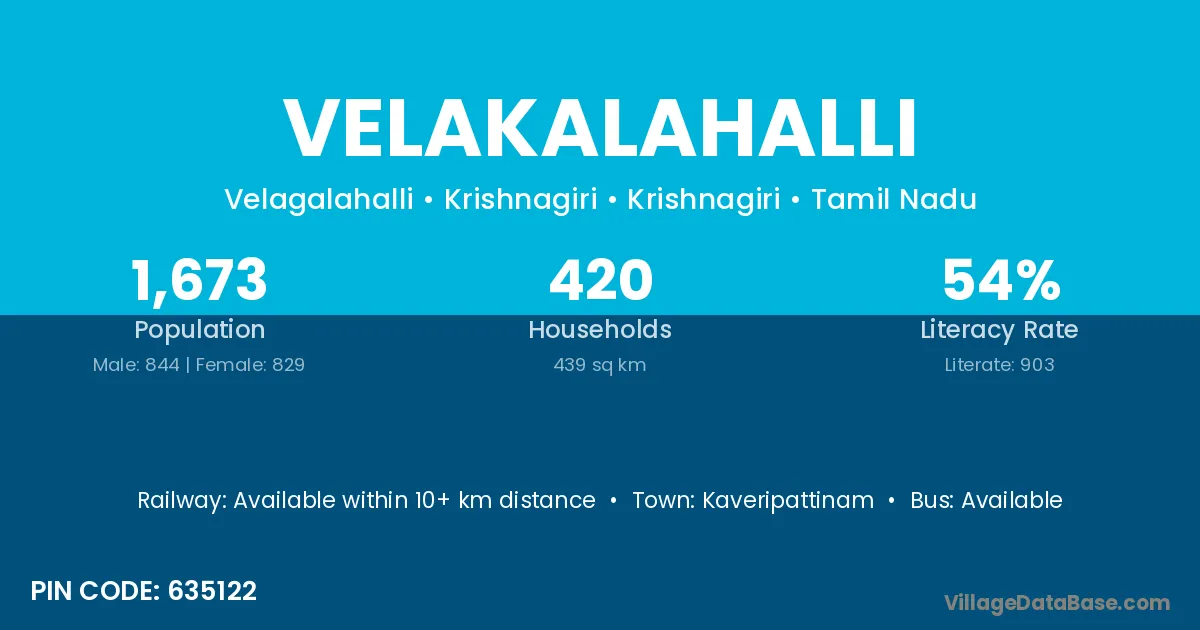 Velakalahalli village has a total population of 1,673 people, of which 844 are males and 829 are females.