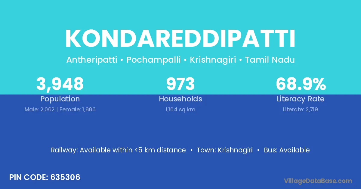 Kondareddipatti village has a total population of 3,948 people, of which 2,062 are males and 1,886 are females.