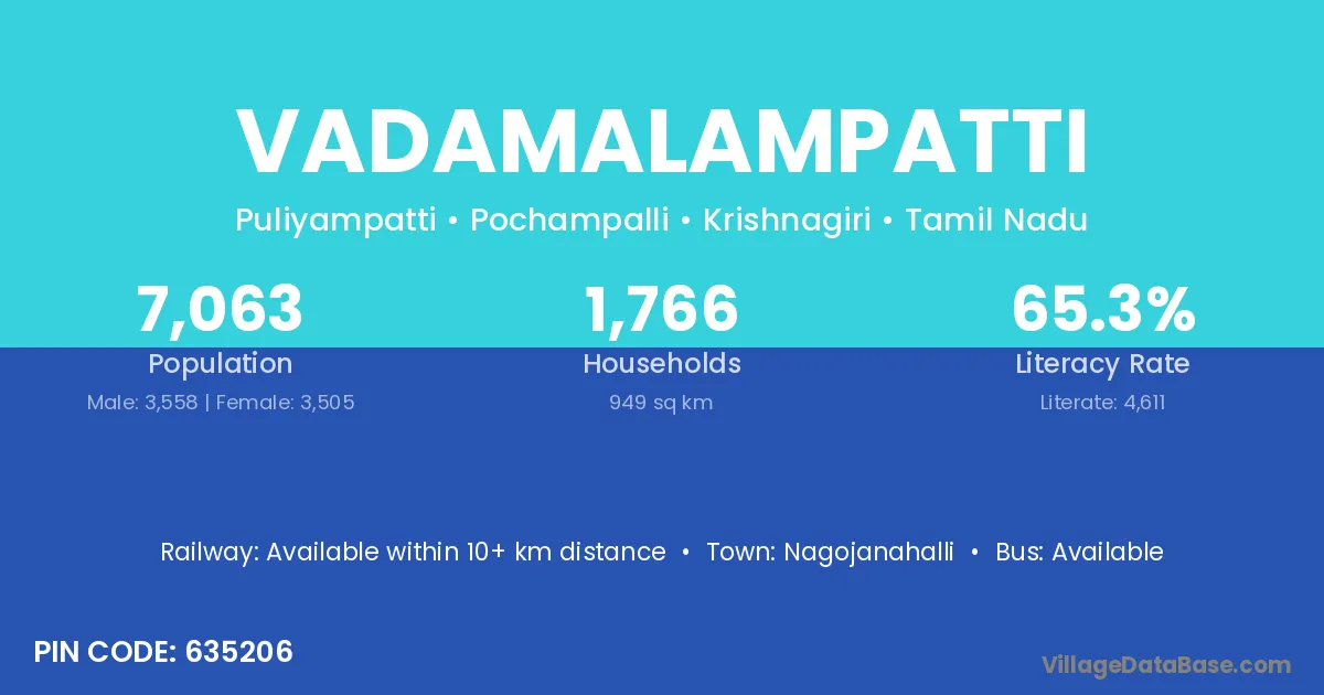 Vadamalampatti village has a total population of 7,063 people, of which 3,558 are males and 3,505 are females.