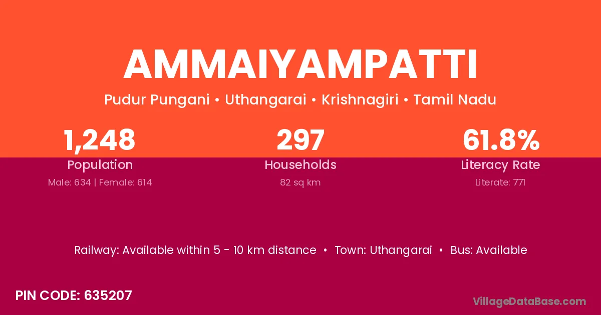 Ammaiyampatti village has a total population of 1,248 people, of which 634 are males and 614 are females.