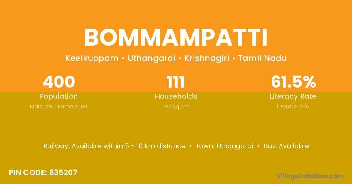 Uthangarai is the nearest town to Bommampatti village for major economic activities