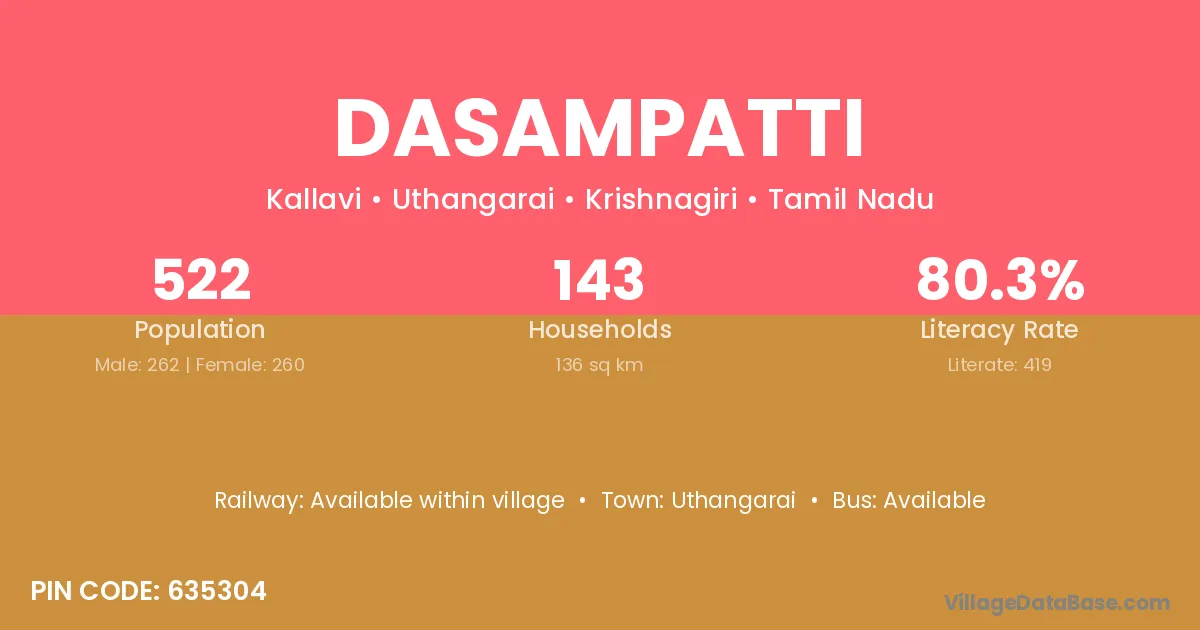 Dasampatti village has a total population of 522 people, of which 262 are males and 260 are females.