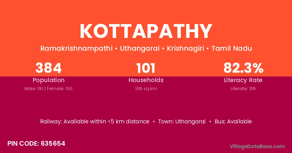 Kottapathy village has a total population of 384 people, of which 191 are males and 193 are females.