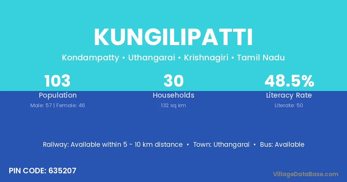 Kungilipatti village has a total population of 103 people, of which 57 are males and 46 are females.