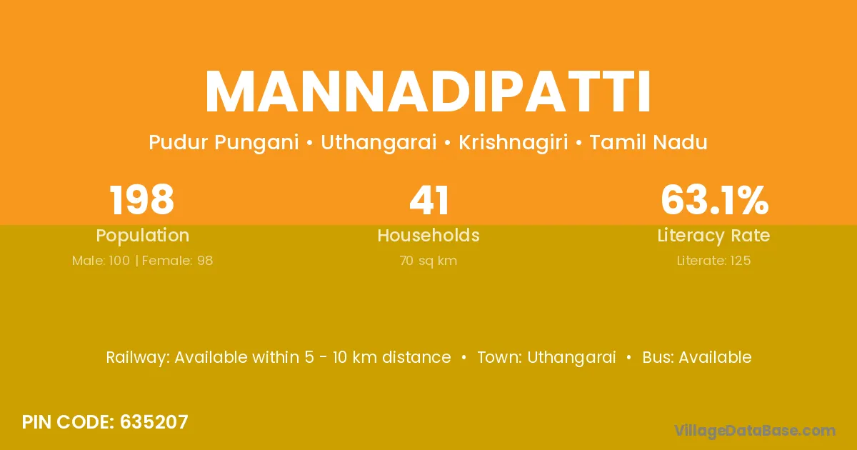 Mannadipatti village has a total population of 198 people, of which 100 are males and 98 are females.