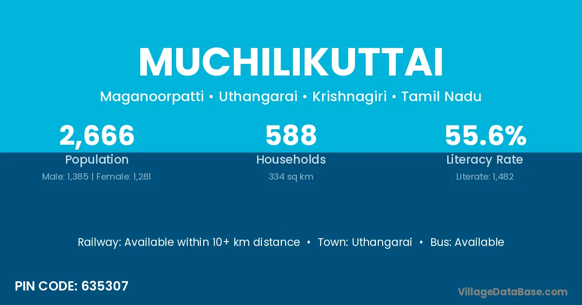 Muchilikuttai village has a total population of 2,666 people, of which 1,385 are males and 1,281 are females.