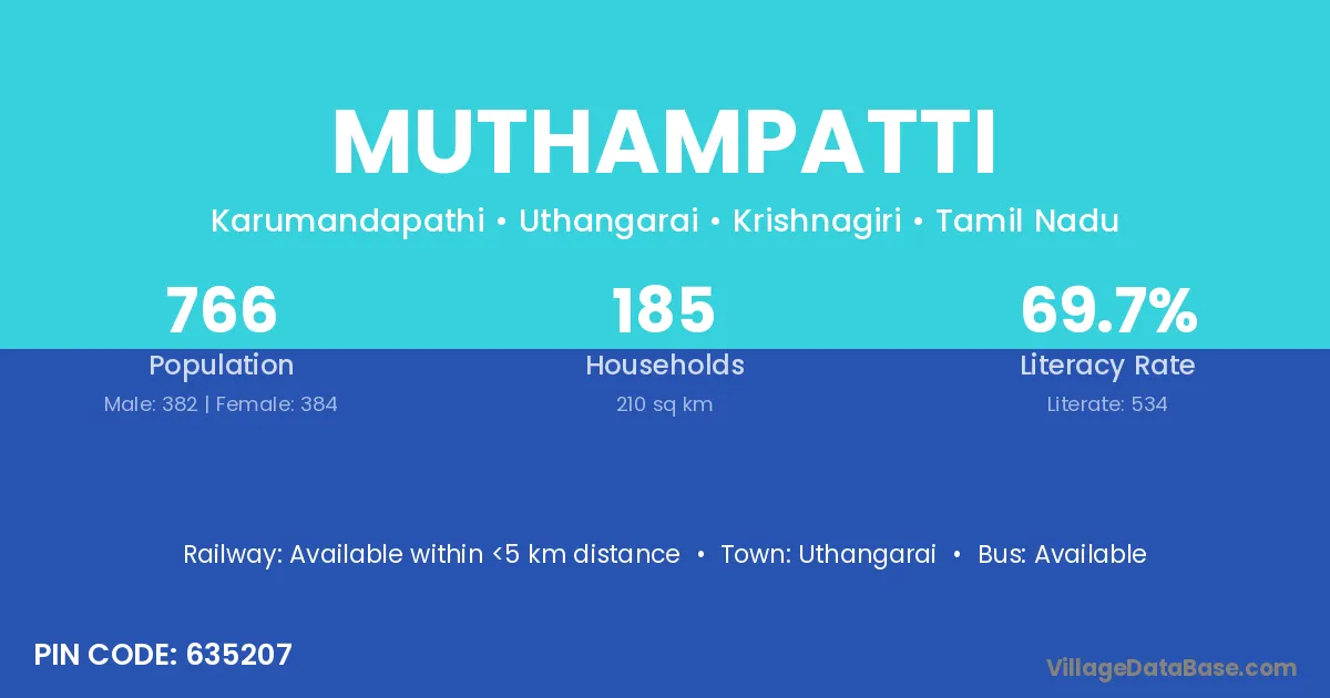 Muthampatti village has a total population of 766 people, of which 382 are males and 384 are females.