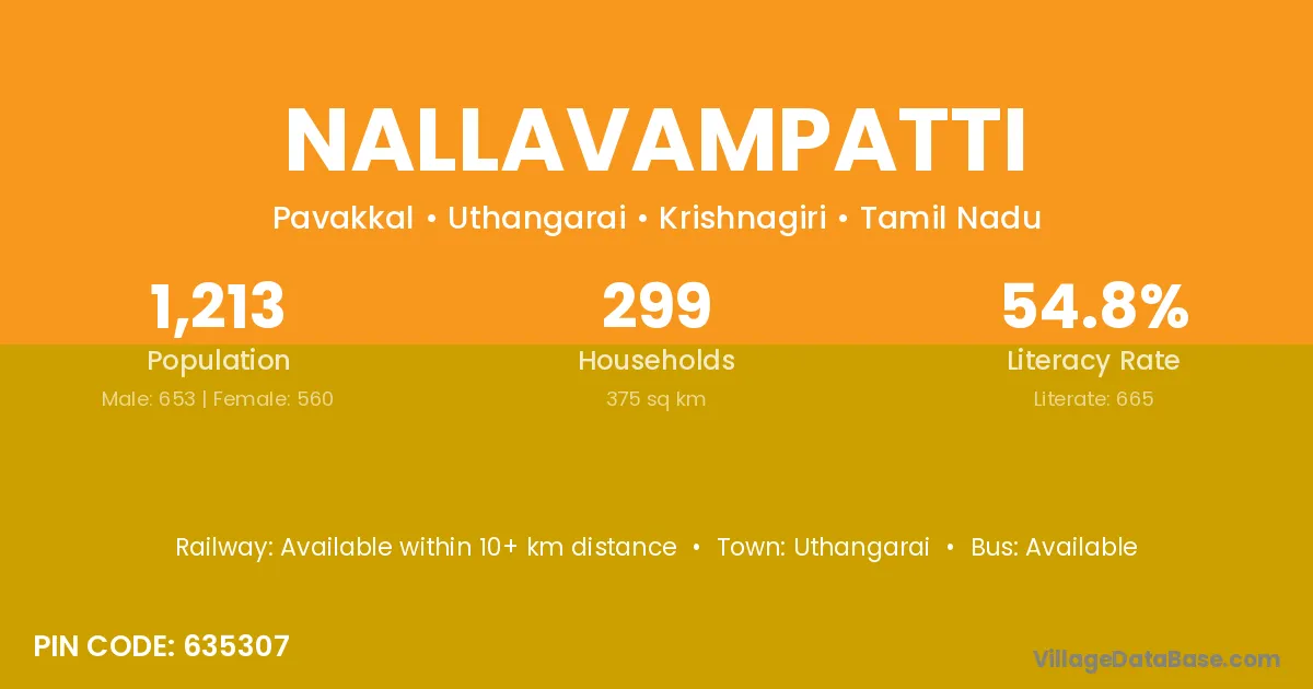Nallavampatti village has a total population of 1,213 people, of which 653 are males and 560 are females.