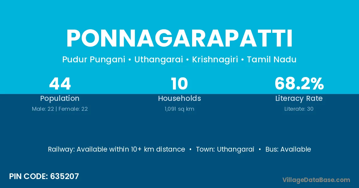 Ponnagarapatti village has a total population of 44 people, of which 22 are males and 22 are females.