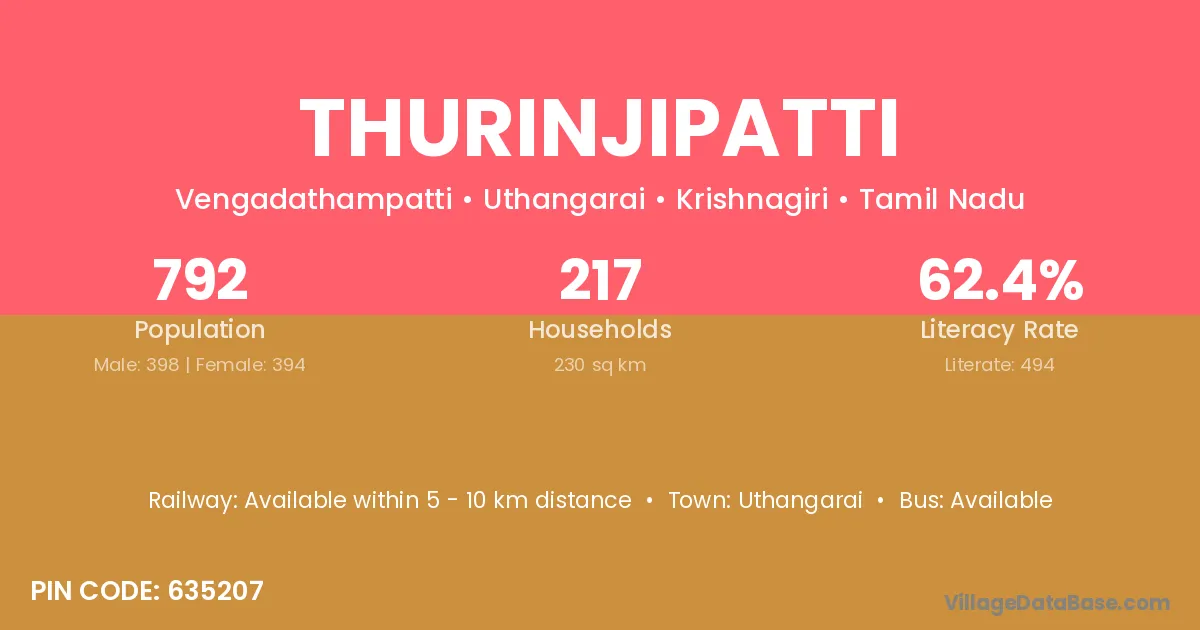 Thurinjipatti village has a total population of 792 people, of which 398 are males and 394 are females.