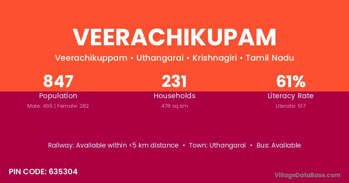 Veerachikupam village has a total population of 847 people, of which 465 are males and 382 are females.
