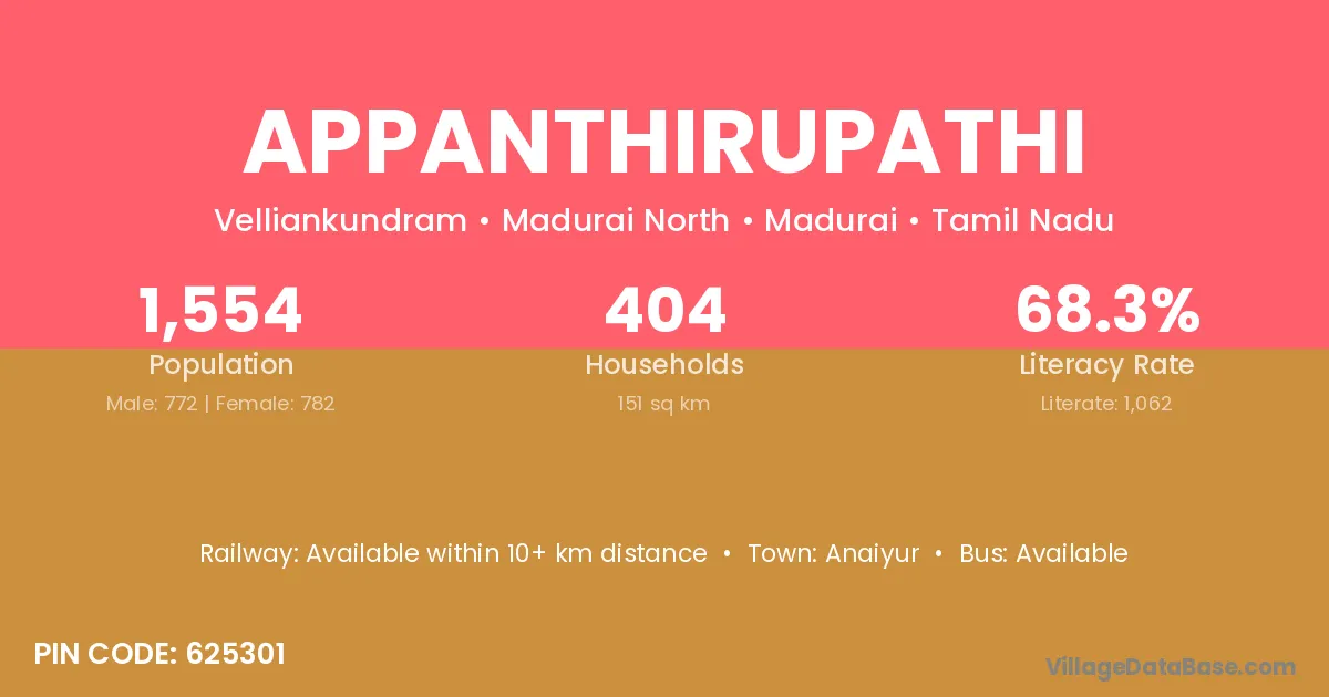 According to Census 2011 information, the village code of Appanthirupathi village is 625301.