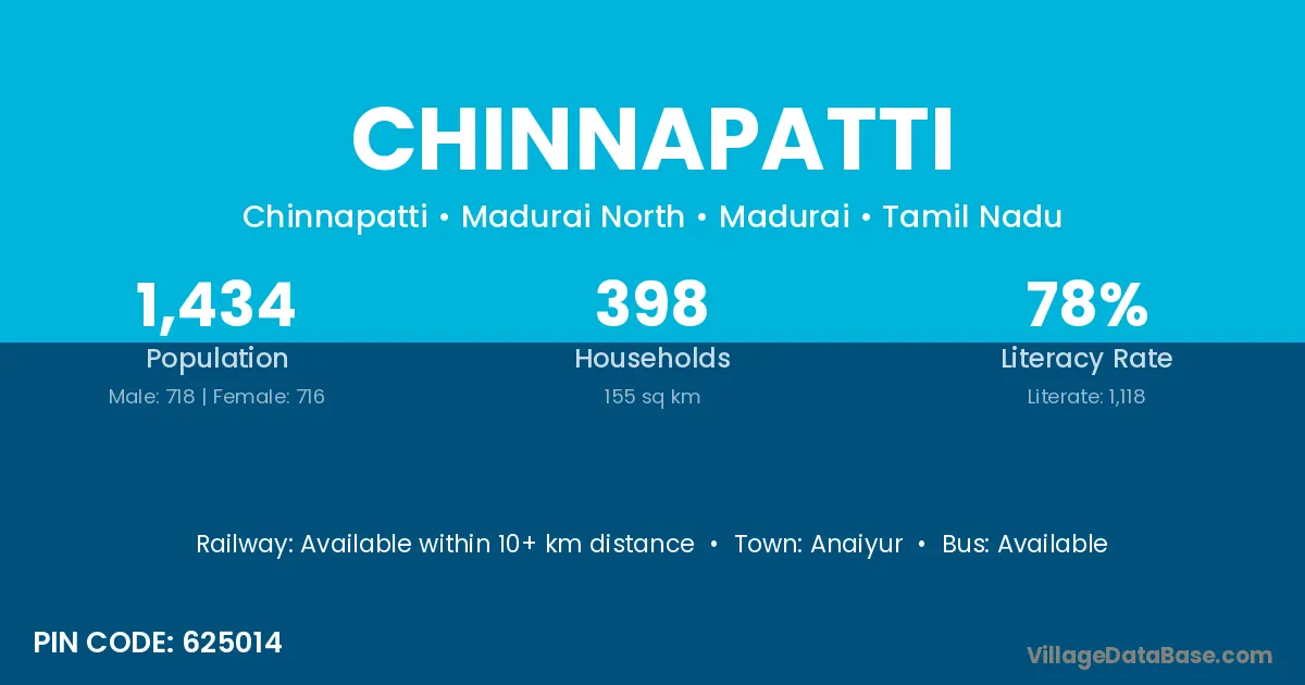 Chinnapatti village has a total population of 1,434 people, of which 718 are males and 716 are females.