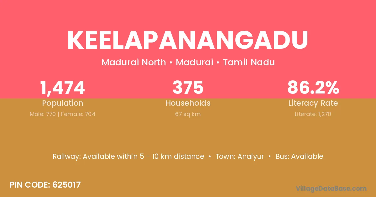 Keelapanangadu village has a total population of 1,474 people, of which 770 are males and 704 are females.