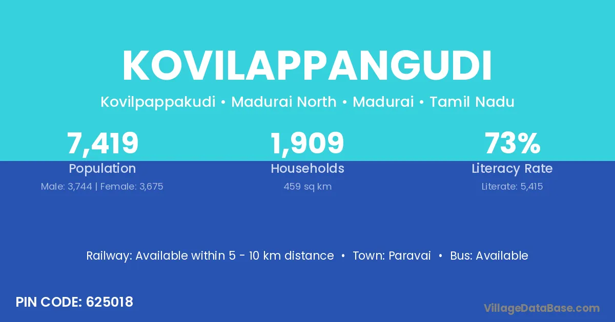 Kovilappangudi village has a total population of 7,419 people, of which 3,744 are males and 3,675 are females.