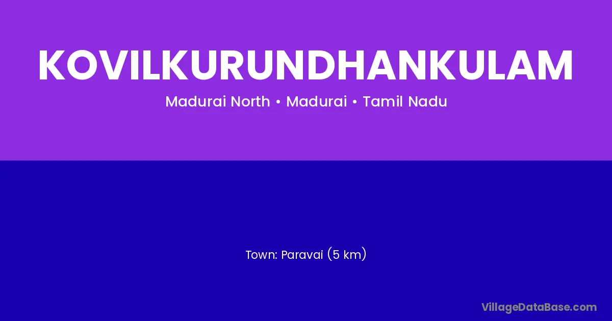 Paravai (5 km) is the nearest town to Kovilkurundhankulam village for major economic activities and is located approximately 5 km away.