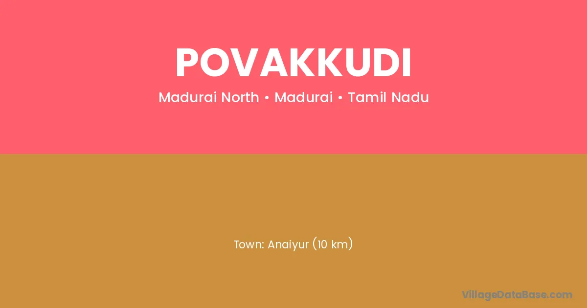 Anaiyur (10 km) is the nearest town to Povakkudi village for major economic activities and is located approximately 10 km away.