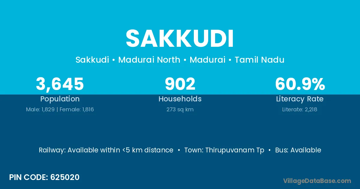 According to Census 2011 information, the village code of Sakkudi village is 625020.