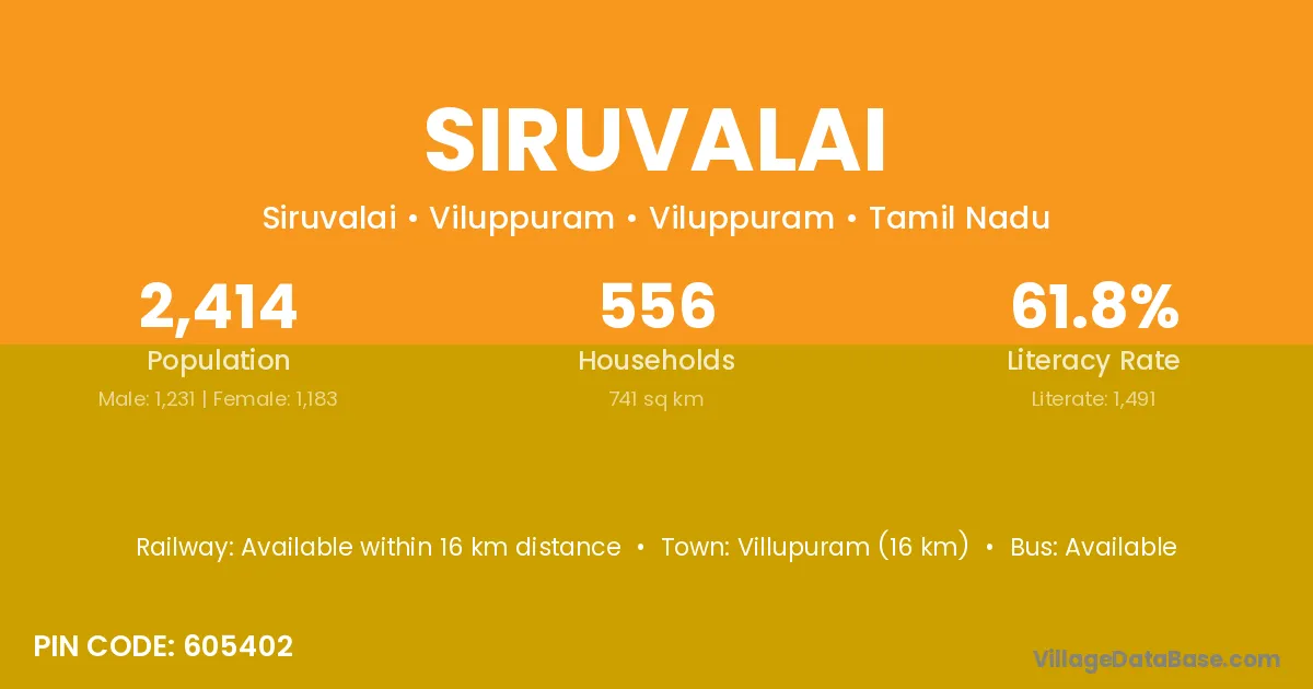 Siruvalai village has a total population of 1,282 people, of which 636 are males and 646 are females.