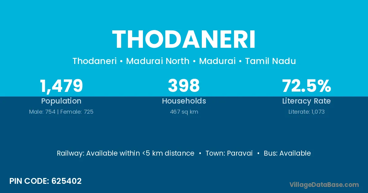 Thodaneri village has a total population of 1,479 people, of which 754 are males and 725 are females.