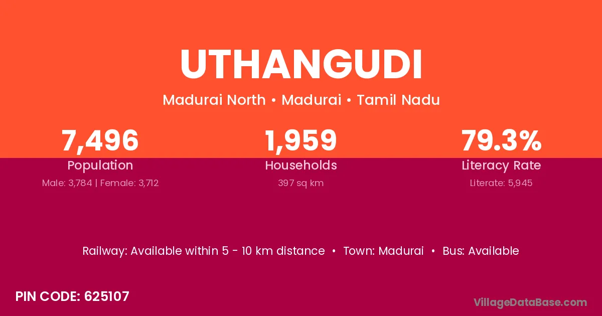 Uthangudi village has a total population of 7,496 people, of which 3,784 are males and 3,712 are females.