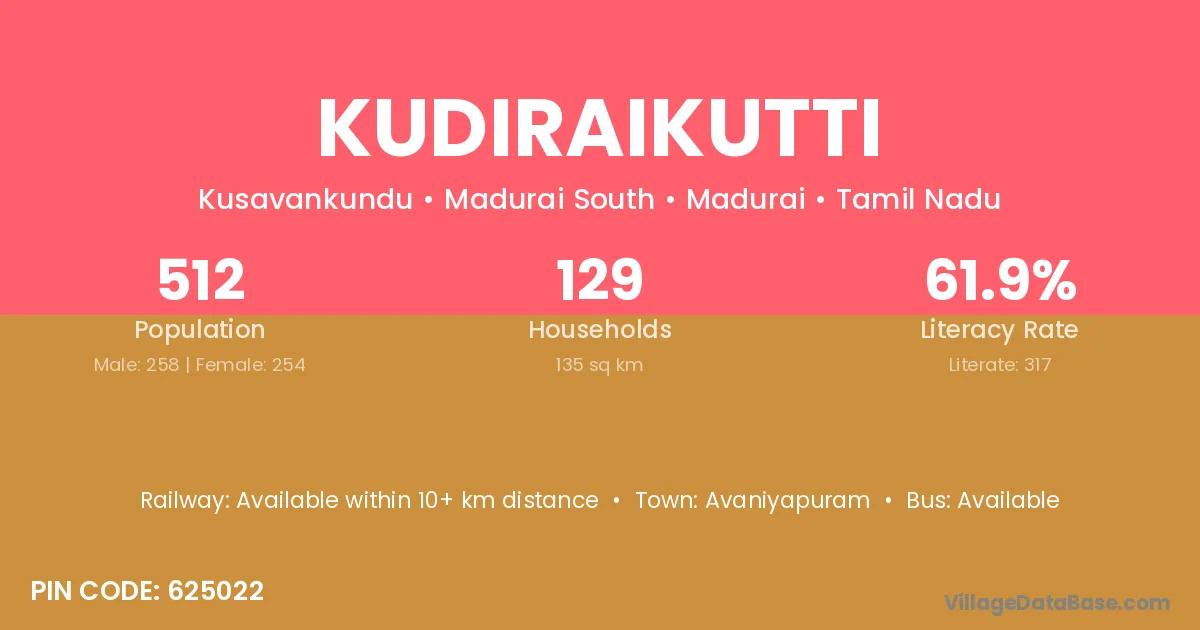 Kudiraikutti village has a total population of 512 people, of which 258 are males and 254 are females.