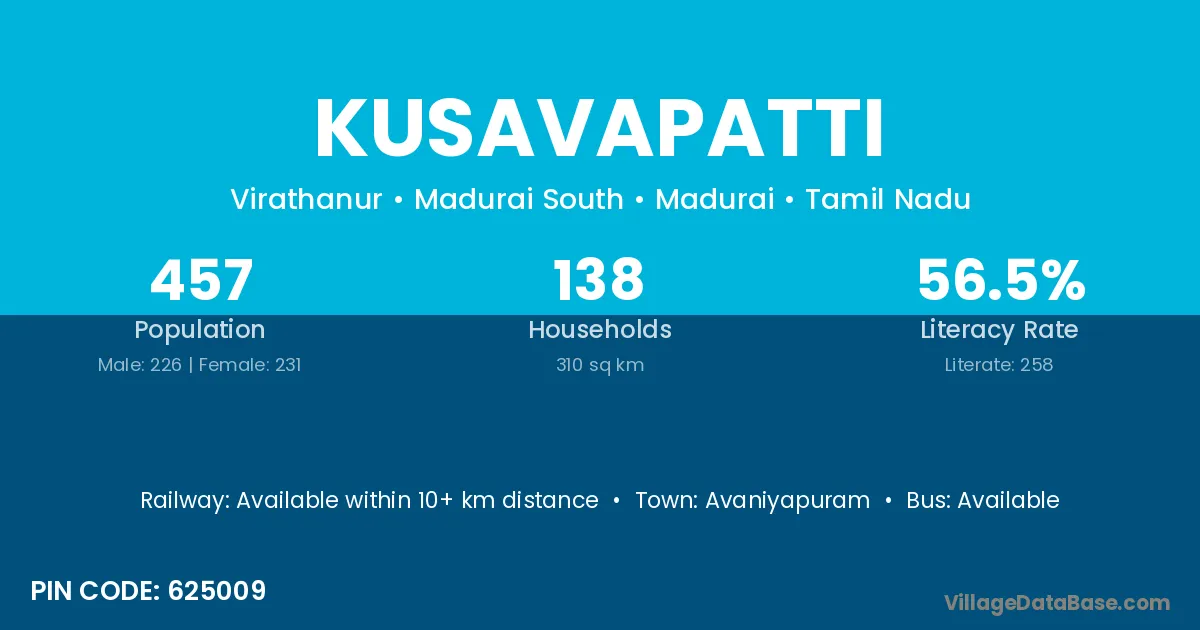 Kusavapatti village has a total population of 457 people, of which 226 are males and 231 are females.