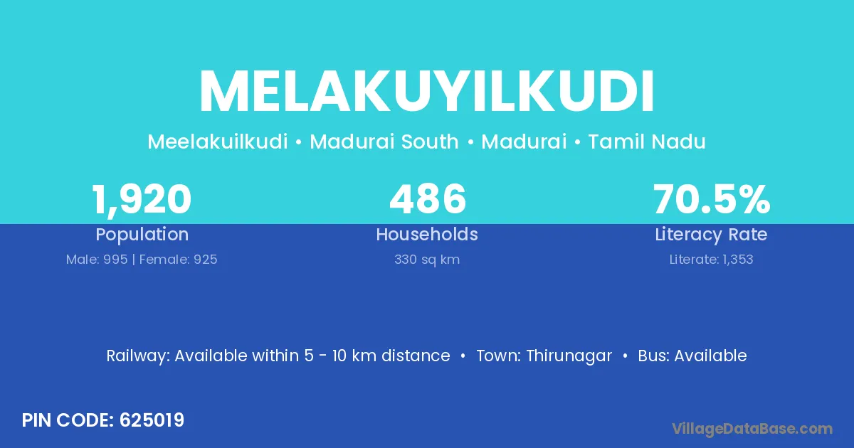 Melakuyilkudi village has a total population of 1,920 people, of which 995 are males and 925 are females.