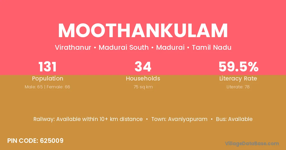 Moothankulam village has a total population of 131 people, of which 65 are males and 66 are females.