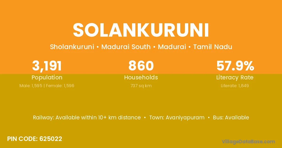 Avaniyapuram is the nearest town to Solankuruni village for major economic activities