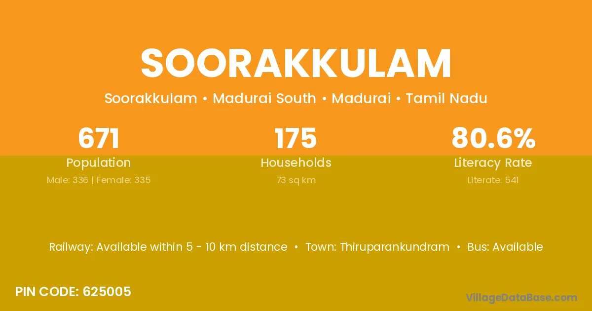 Soorakkulam village has a total population of 671 people, of which 336 are males and 335 are females.