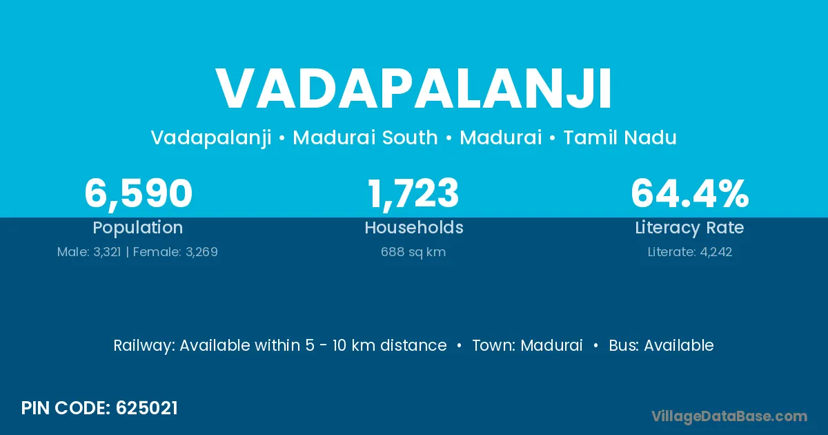 Vadapalanji village has a total population of 6,590 people, of which 3,321 are males and 3,269 are females.