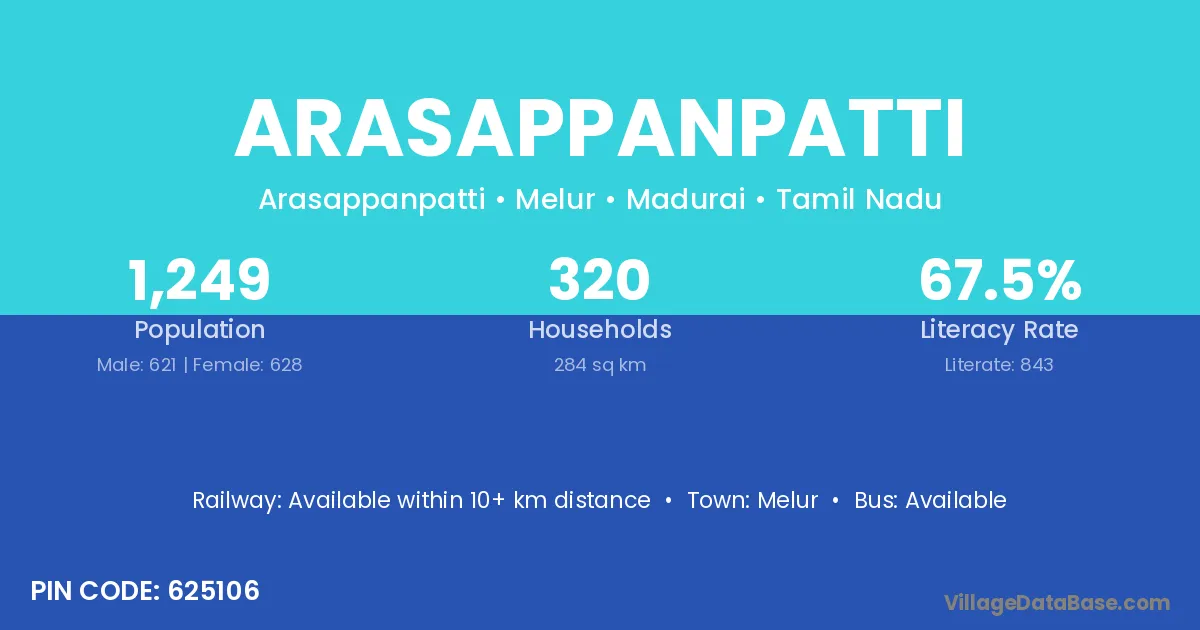 Arasappanpatti village has a total population of 1,249 people, of which 621 are males and 628 are females.