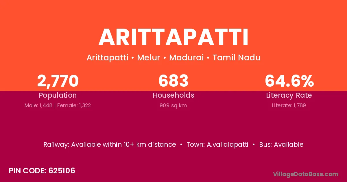 Arittapatti village has a total population of 2,770 people, of which 1,448 are males and 1,322 are females.