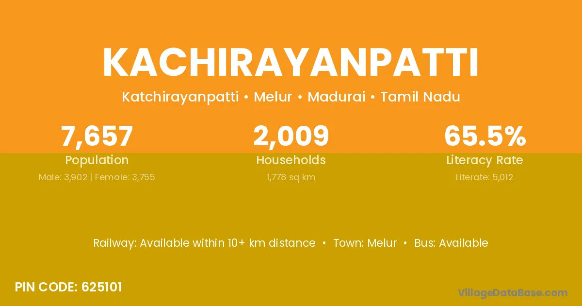 Kachirayanpatti village has a total population of 7,657 people, of which 3,902 are males and 3,755 are females.