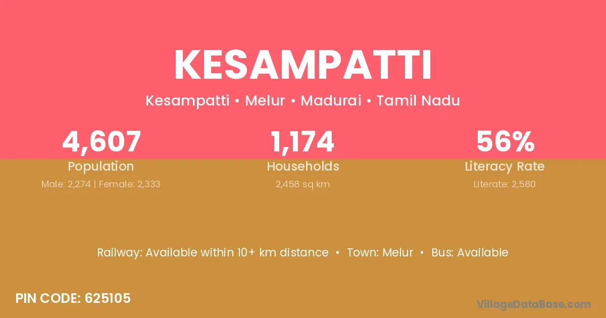 Kesampatti village has a total population of 4,607 people, of which 2,274 are males and 2,333 are females.