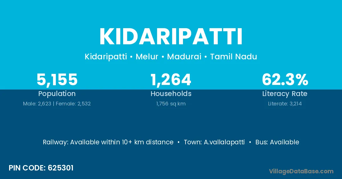 Kidaripatti village has a total population of 5,155 people, of which 2,623 are males and 2,532 are females.