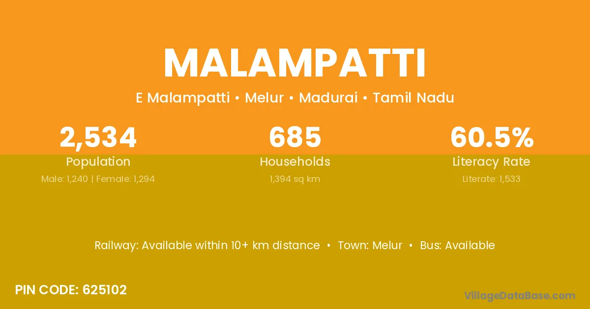According to Census 2011 information, the village code of Malampatti village is 625102.