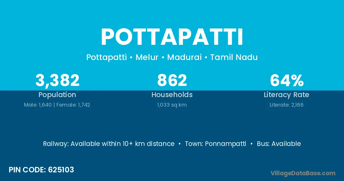 Pottapatti village has a total population of 3,382 people, of which 1,640 are males and 1,742 are females.
