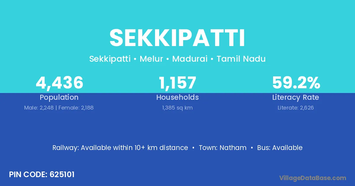 Sekkipatti village has a total population of 4,436 people, of which 2,248 are males and 2,188 are females.