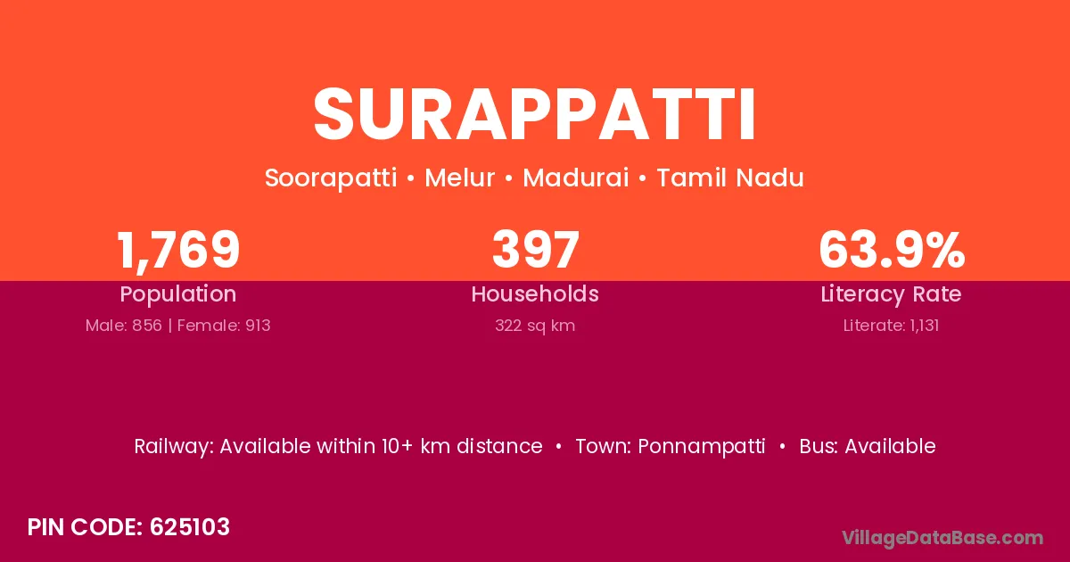 Surappatti village has a total population of 1,769 people, of which 856 are males and 913 are females.