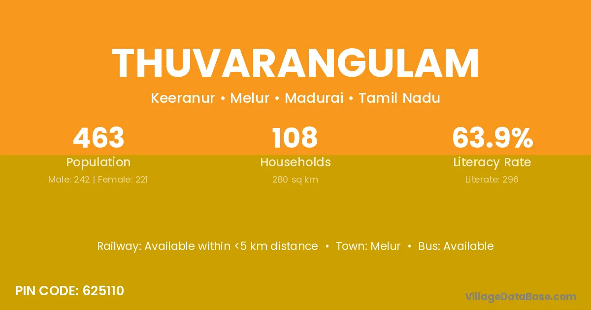 Thuvarangulam village has a total population of 463 people, of which 242 are males and 221 are females.