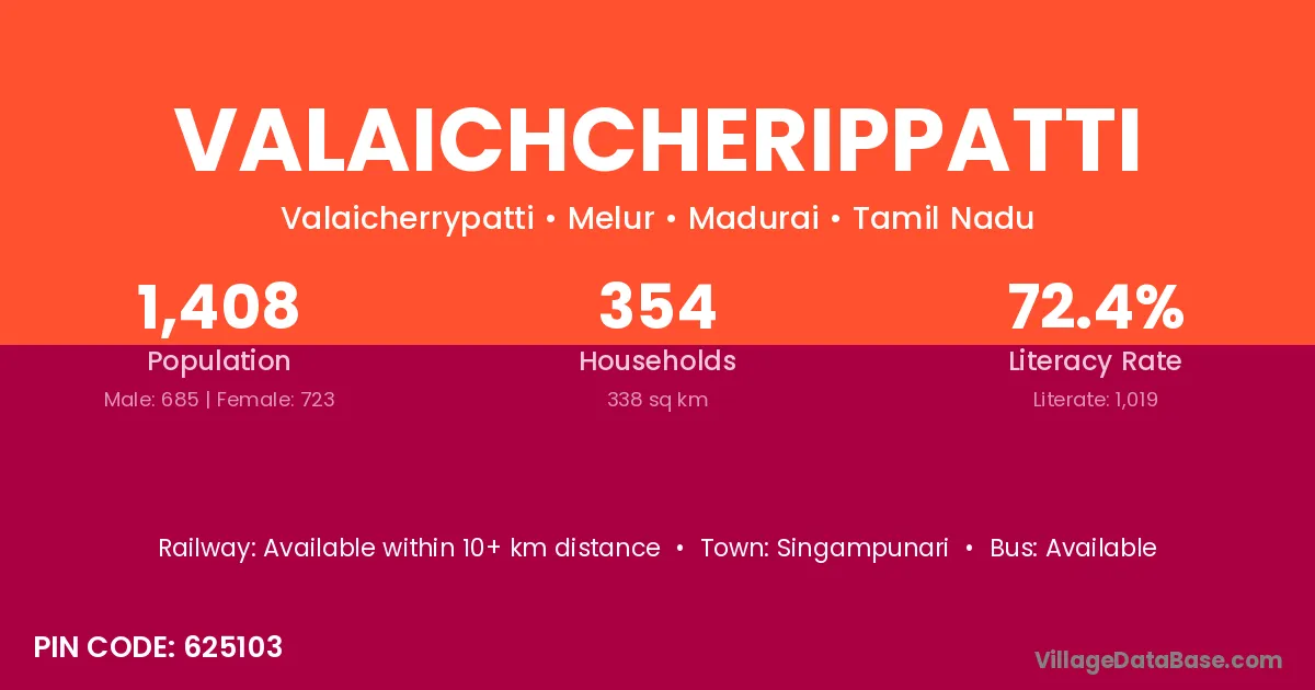 Valaichcherippatti village has a total population of 1,408 people, of which 685 are males and 723 are females.