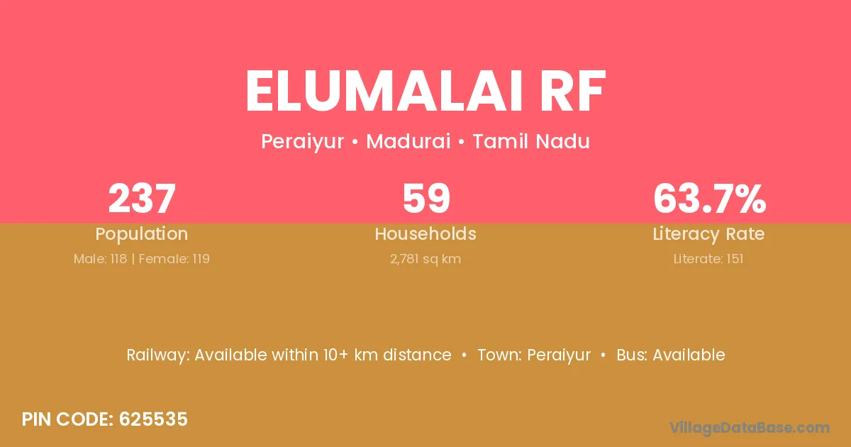 Elumalai Rf village has a total population of 237 people, of which 118 are males and 119 are females.