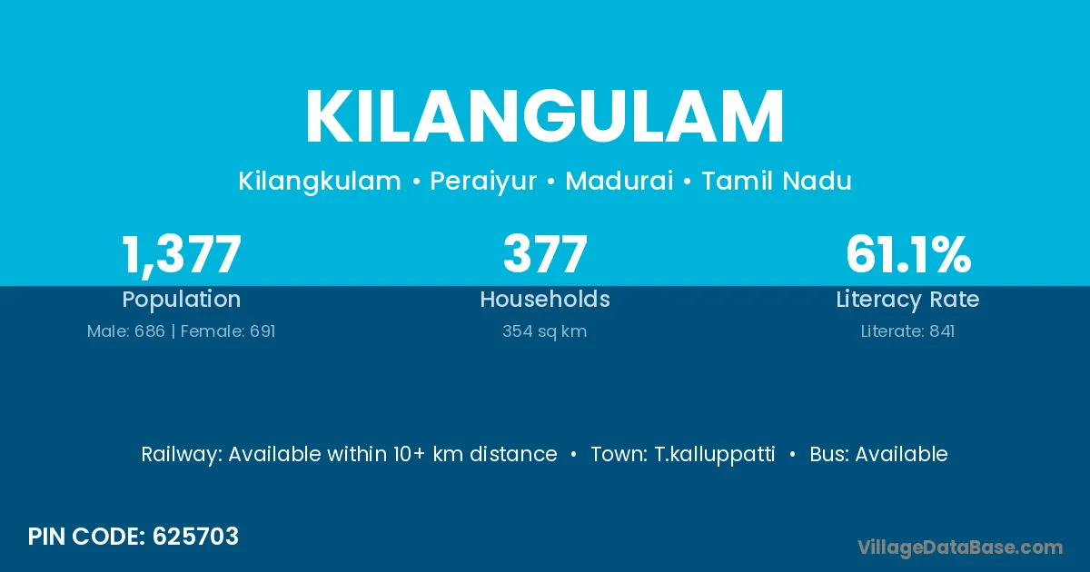 Kilangulam village has a total population of 1,377 people, of which 686 are males and 691 are females.