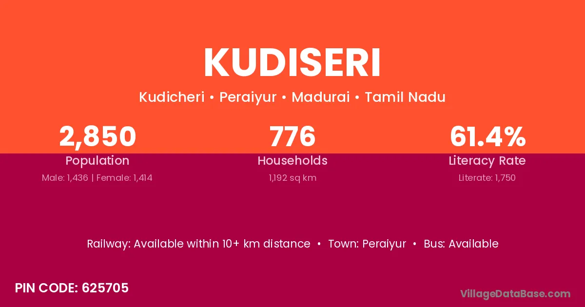 Kudiseri village has a total population of 2,850 people, of which 1,436 are males and 1,414 are females.