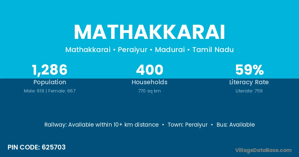 Mathakkarai village has a total population of 1,286 people, of which 619 are males and 667 are females.