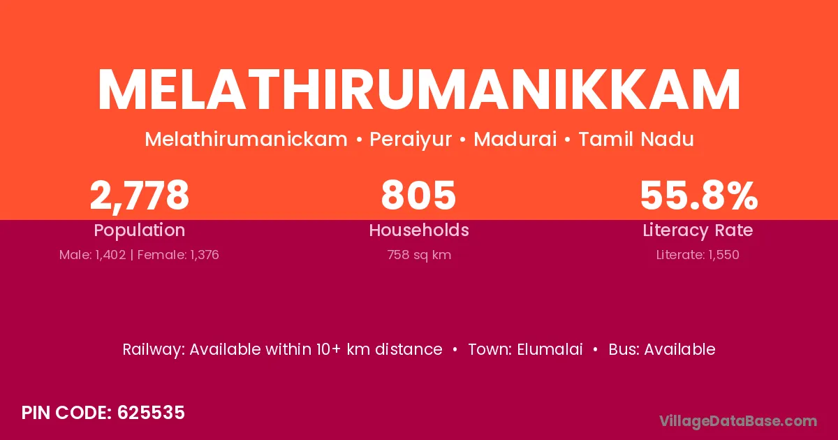 Melathirumanikkam village has a total population of 2,778 people, of which 1,402 are males and 1,376 are females.
