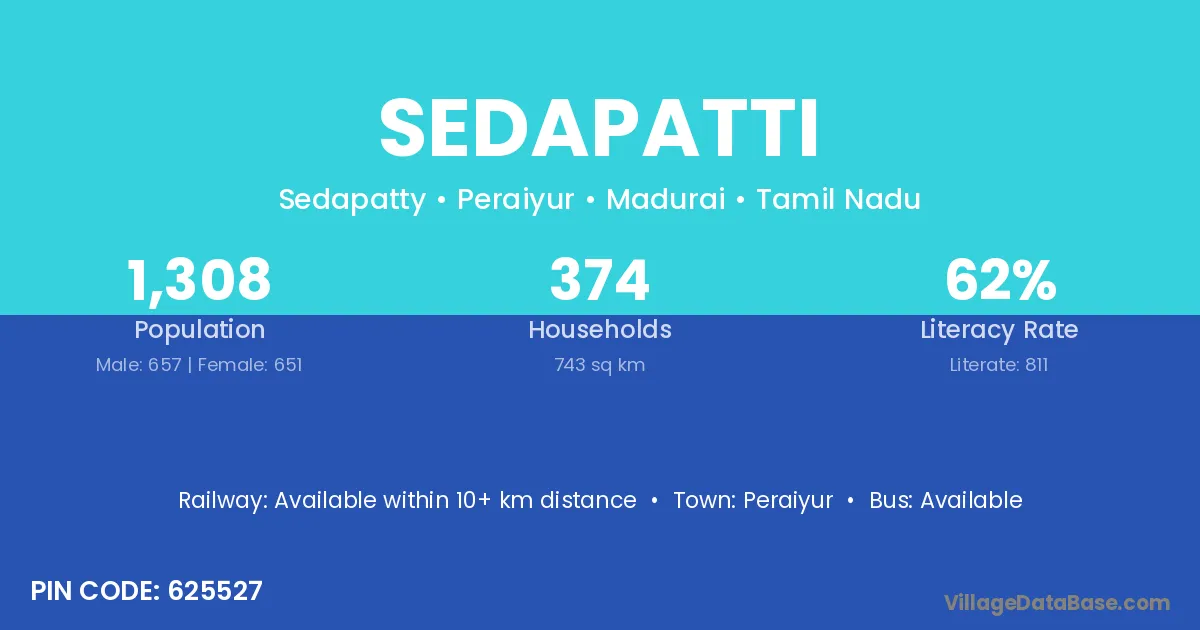 Sedapatti village has a total population of 1,308 people, of which 657 are males and 651 are females.